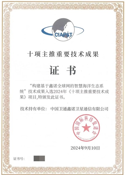 9月12日,由商务部和北京市人民政府共同主办的2024年中国国际服务贸易交易会盛大开幕。本届服贸会秉承“全球服务、互惠共享”的核心理念,以“展览展示+洽谈推介+成果发布”为核心内容,致力于打造全球服务贸易领域的国际交易平台。在本次服贸会上,鑫诺公司“构建基于‘鑫诺全球网’的智慧海洋生态系统”技术成果入选中国国际科技促进会2024年《十项主推重要技术成果》项目。